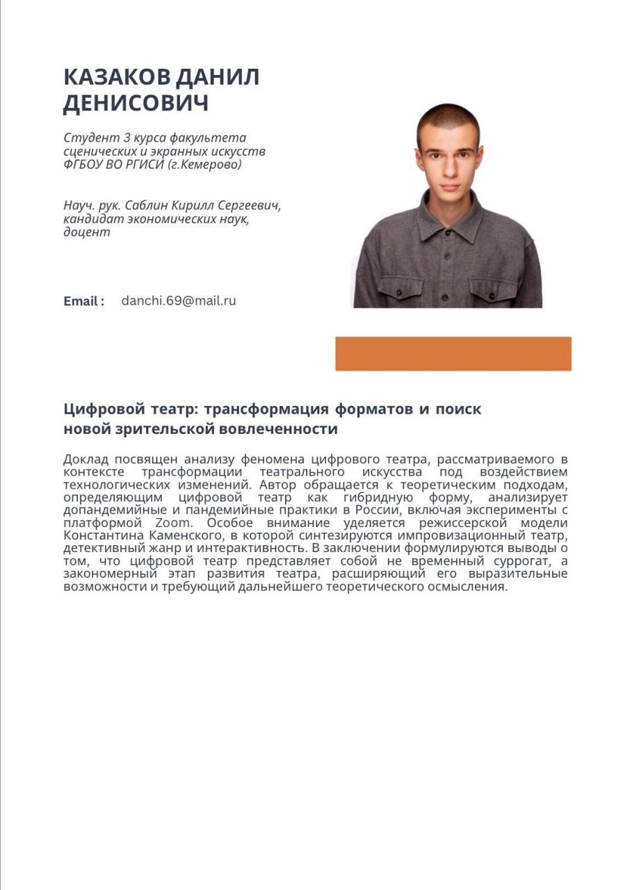 Будущий продюсер Данил Казаков (мастер Ольга Карасева) выступил онлайн на III научно-практической конференции молодых учёных с международным участием «Театр в кино и кино в театре» (г. Москва, ГИТИС). На секции «Новая визуальность: технологии и видео» Данил представил доклад «Цифровой театр: трансформация форматов и поиск новой зрительской вовлеченности» (научный руководитель: кандидат экономических наук, доцент Кирилл Саблин).