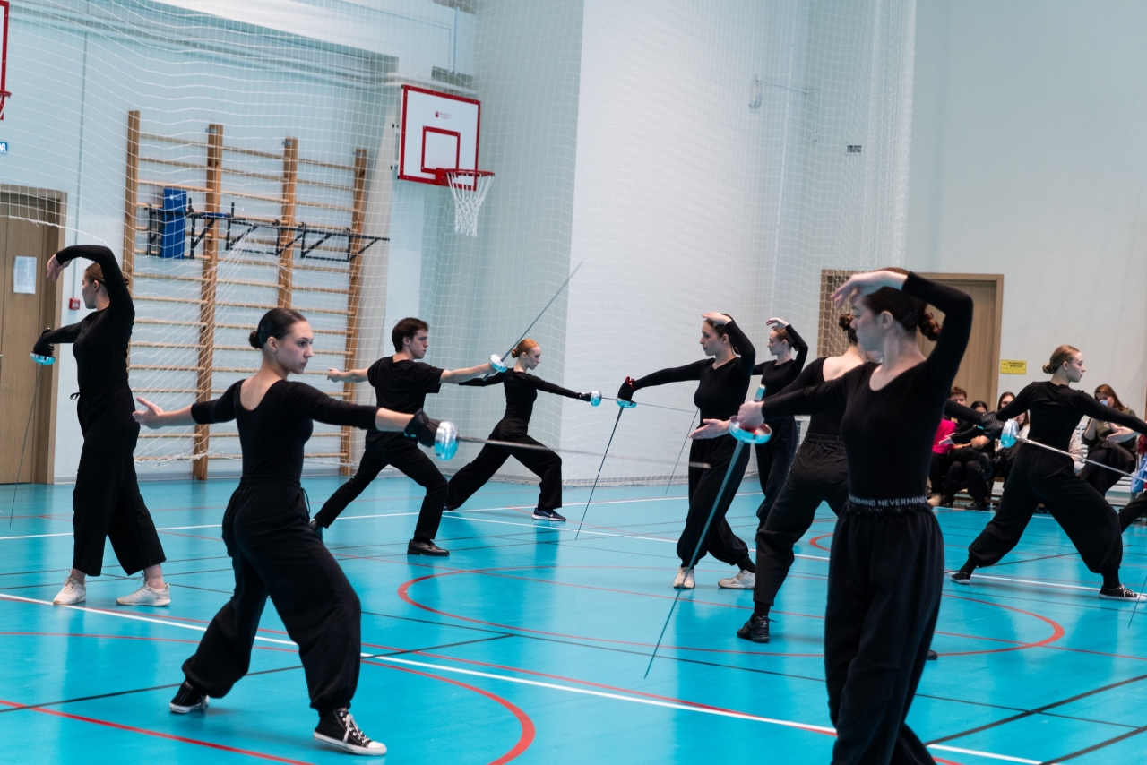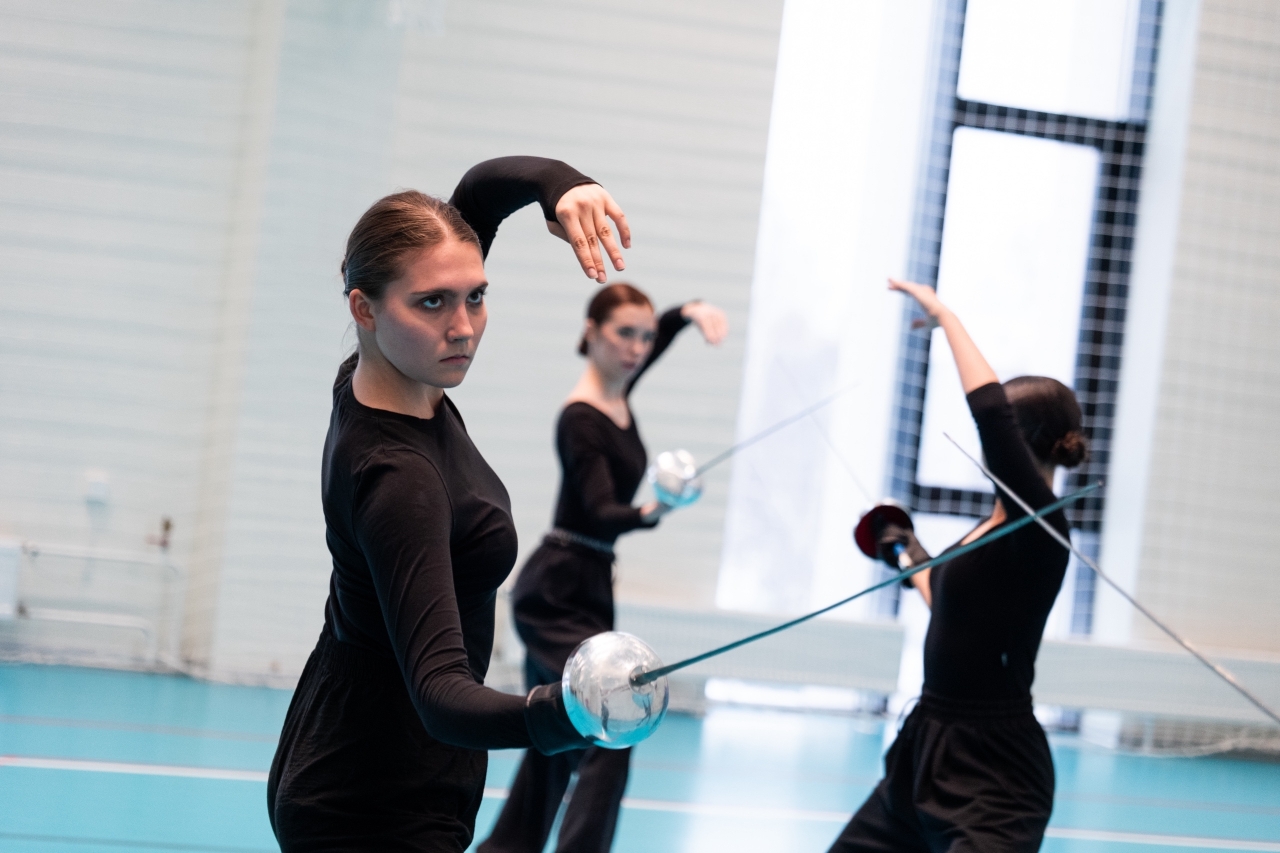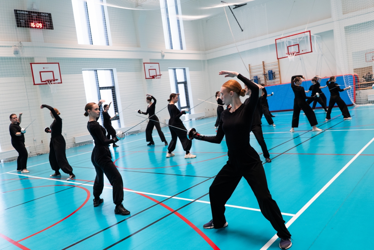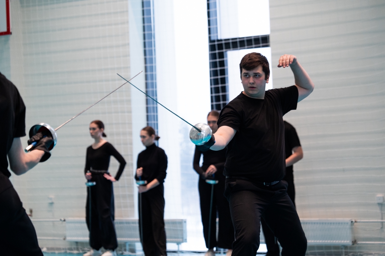 Сначала — по сценическому движению (преподаватель Данила Ибрагимов). На занятиях студенты осваивали технику фехтования. На показе представили отработанные приемы (приветствие, стойки, атаки, блок, парирование, уход, поклон и др.) и короткий бой, состоящий из нескольких комбинаций. Они проделали огромную работу, ведь каждое движение должно быть предельно отточено, а навыки — доведены до автоматизма.