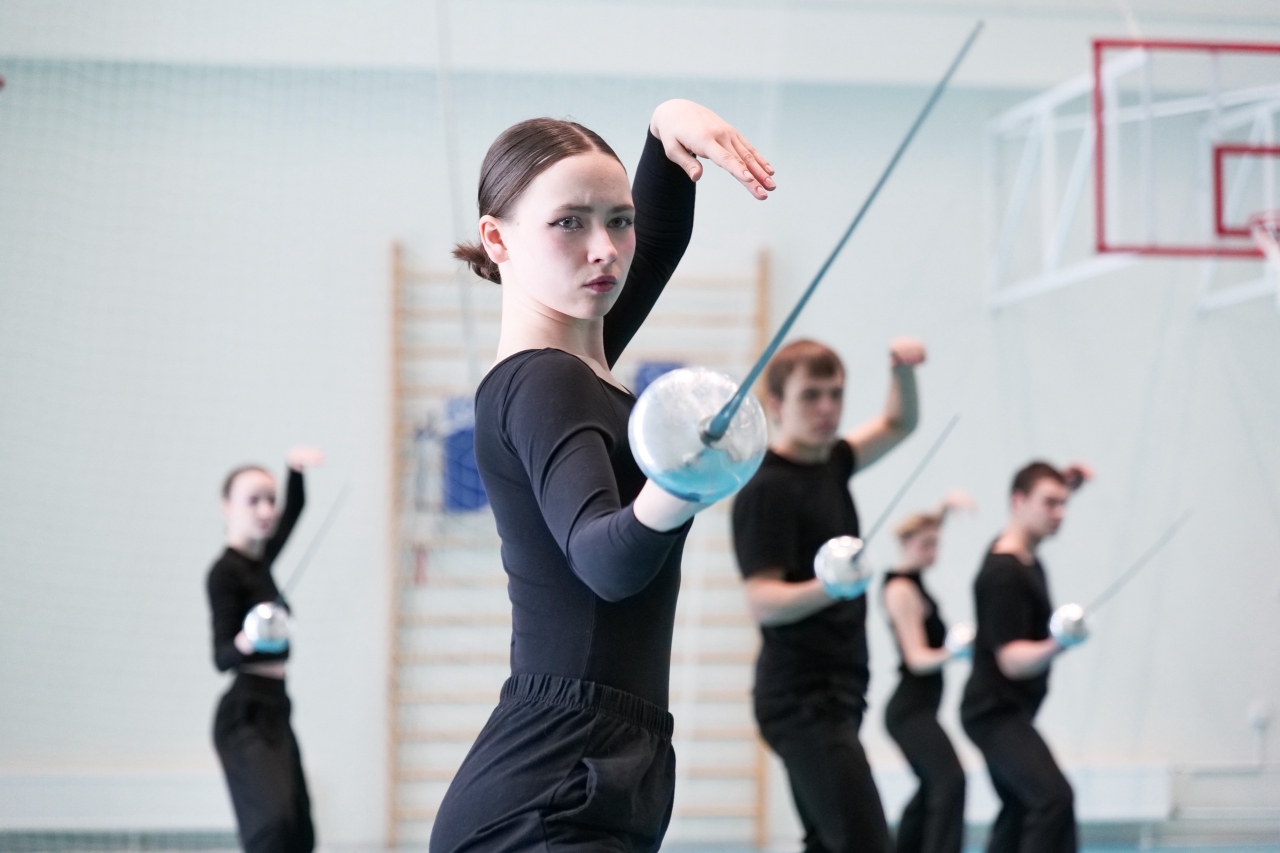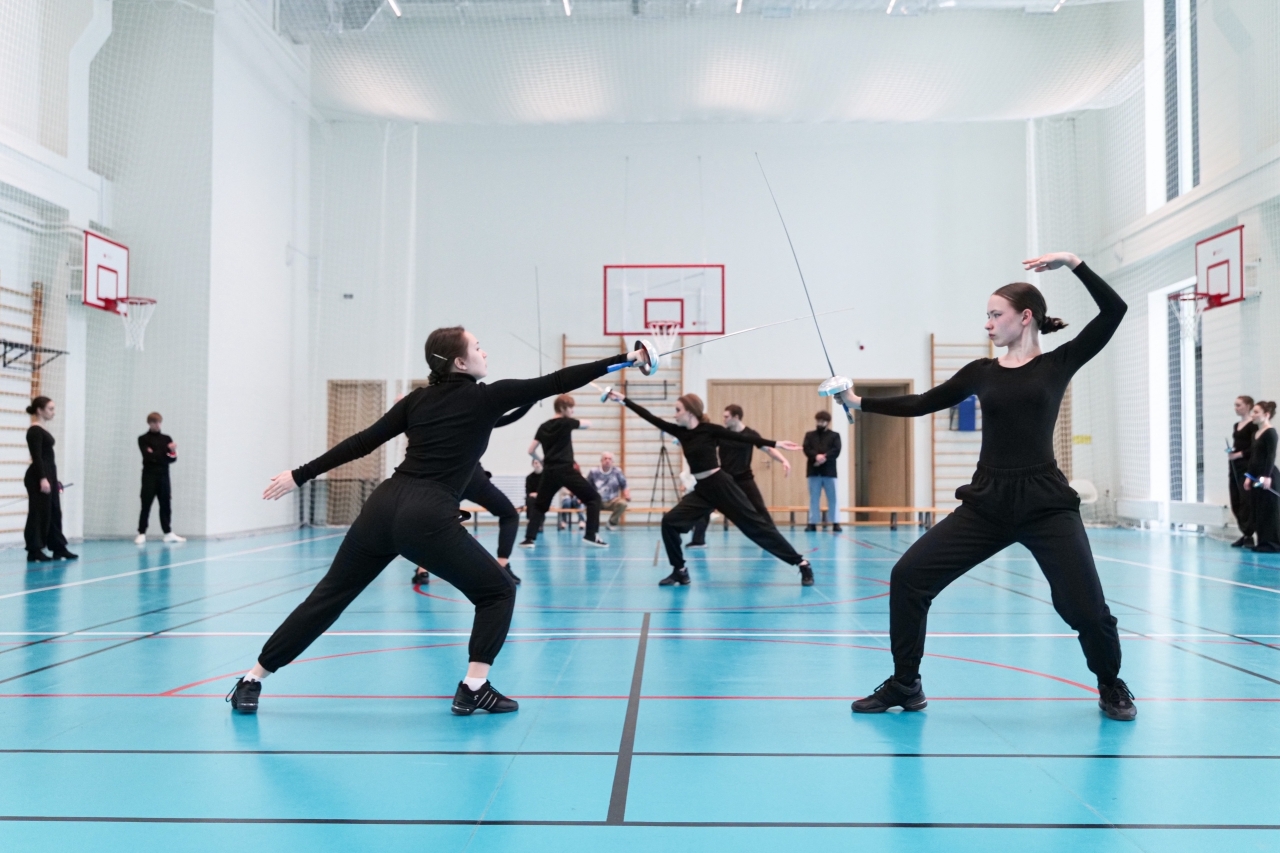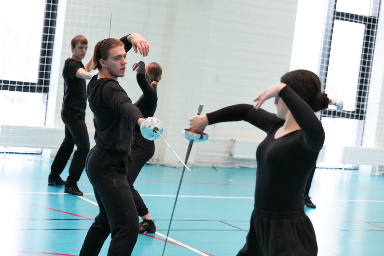 На контрольном уроке по сценическому движению студенты продемонстрировали отработанные приемы фехтования: приветствие и стойки, удары и уколы, шаги и атаки, парирование и уход и мн. др. Работая в парах, показали, как умеют держать дистанцию и чувствовать партнера. А завершили — самостоятельно поставленным боем из 8 темпов.