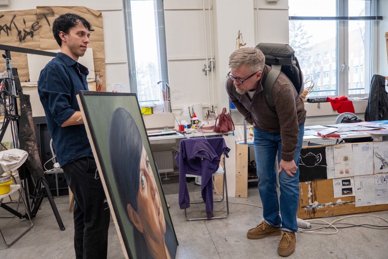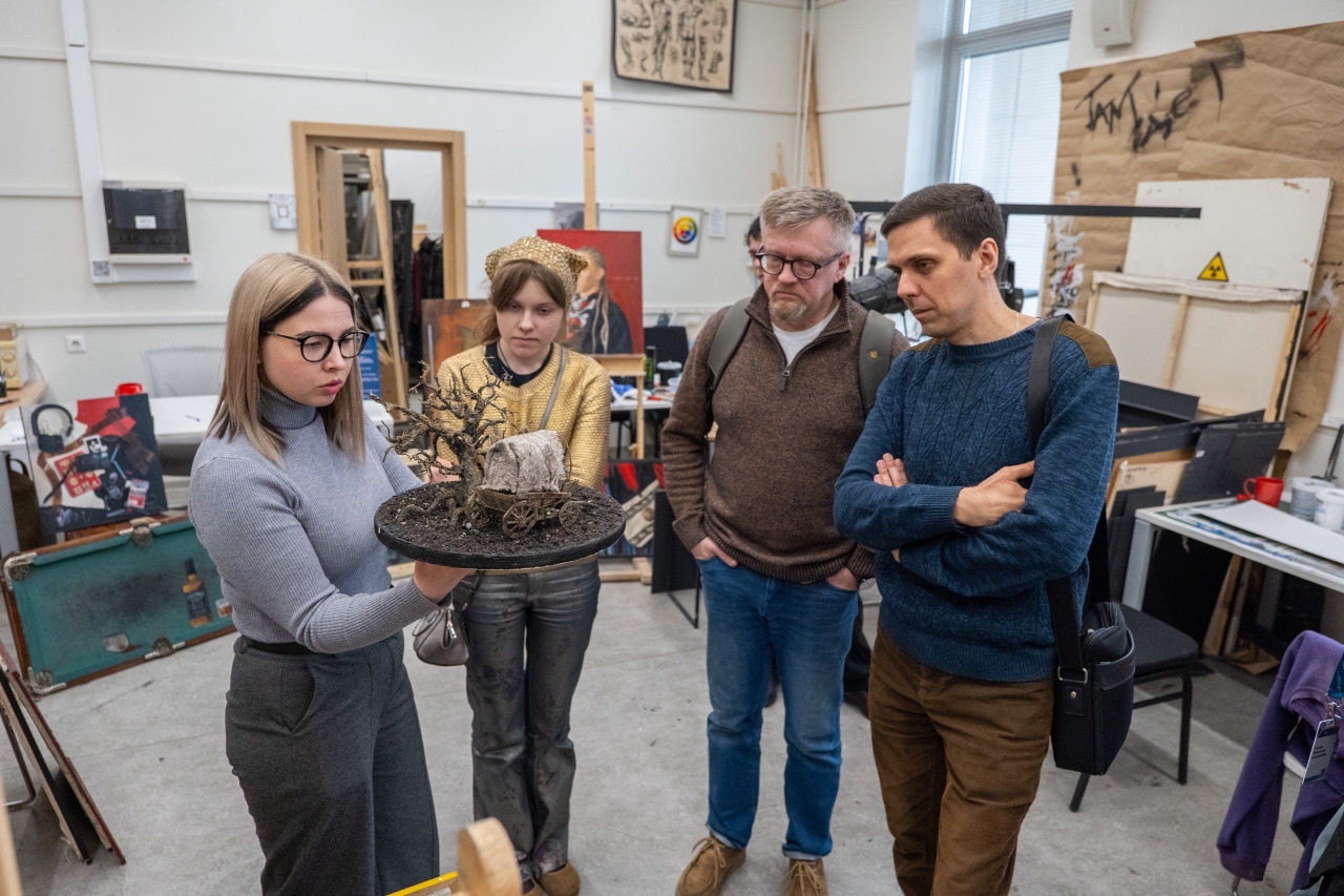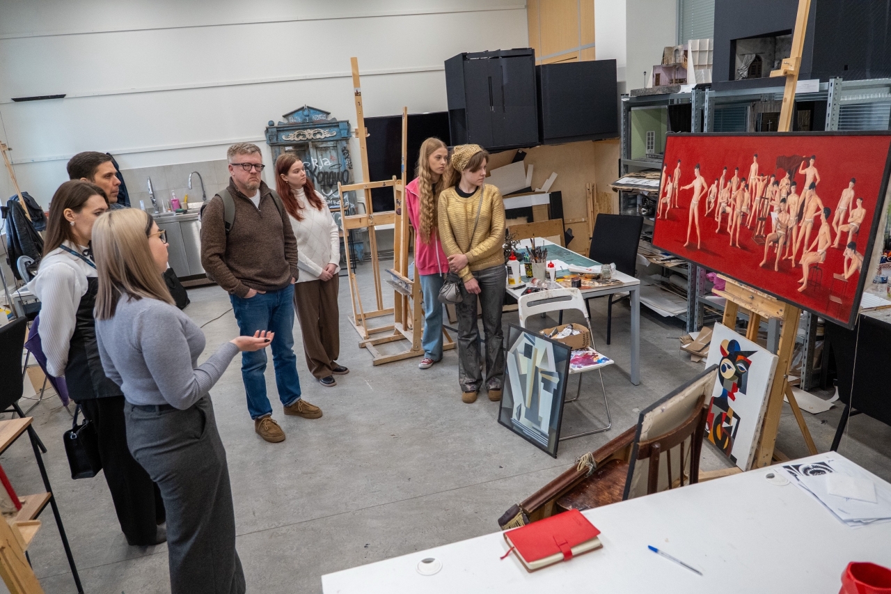 После беседы гости посетили мастерскую Дарьи Каракуловой, где посмотрели учебные, но уже отличающиеся высоким уровнем исполнения работы студентов.